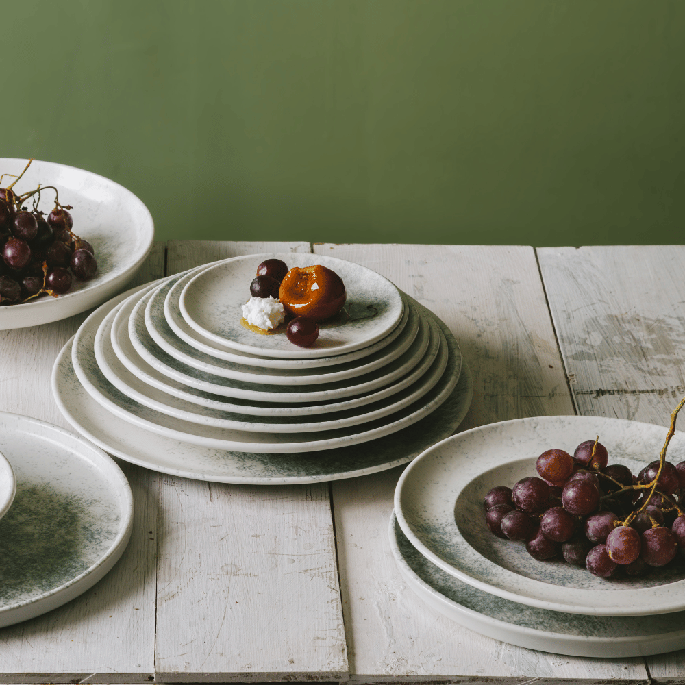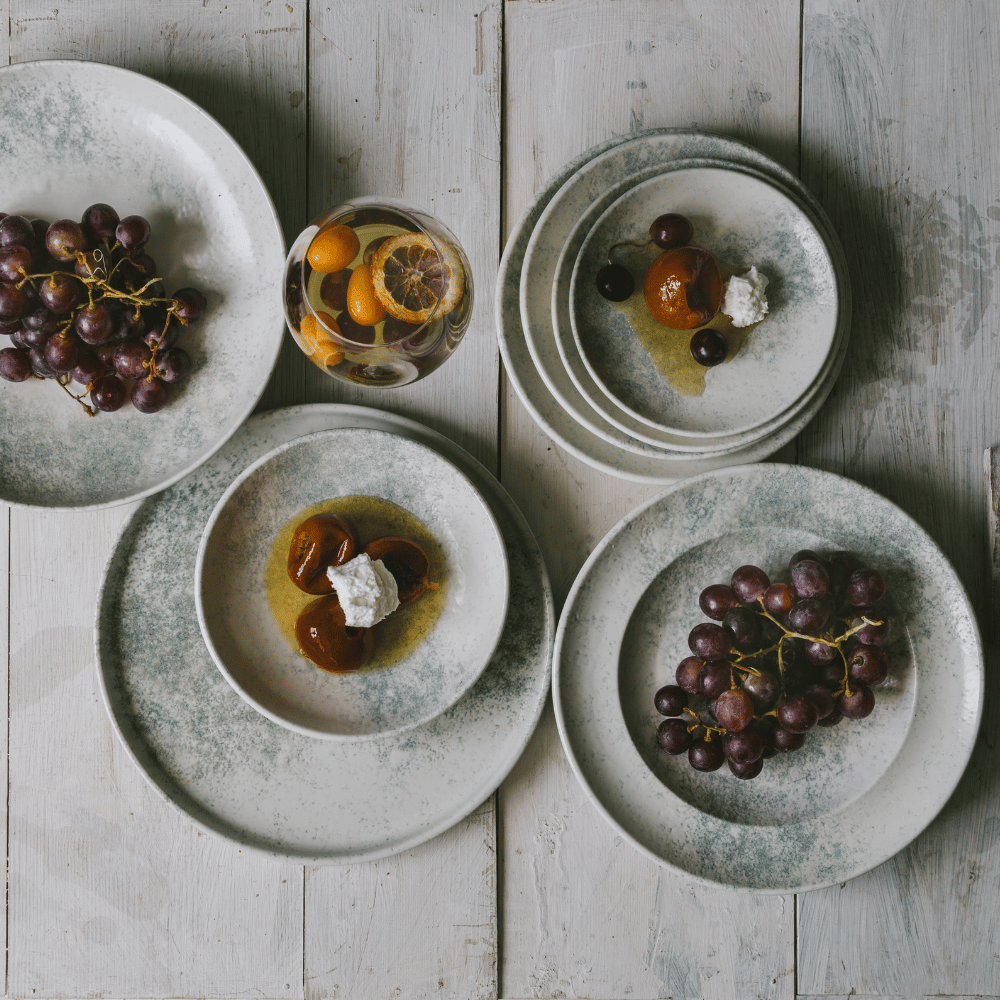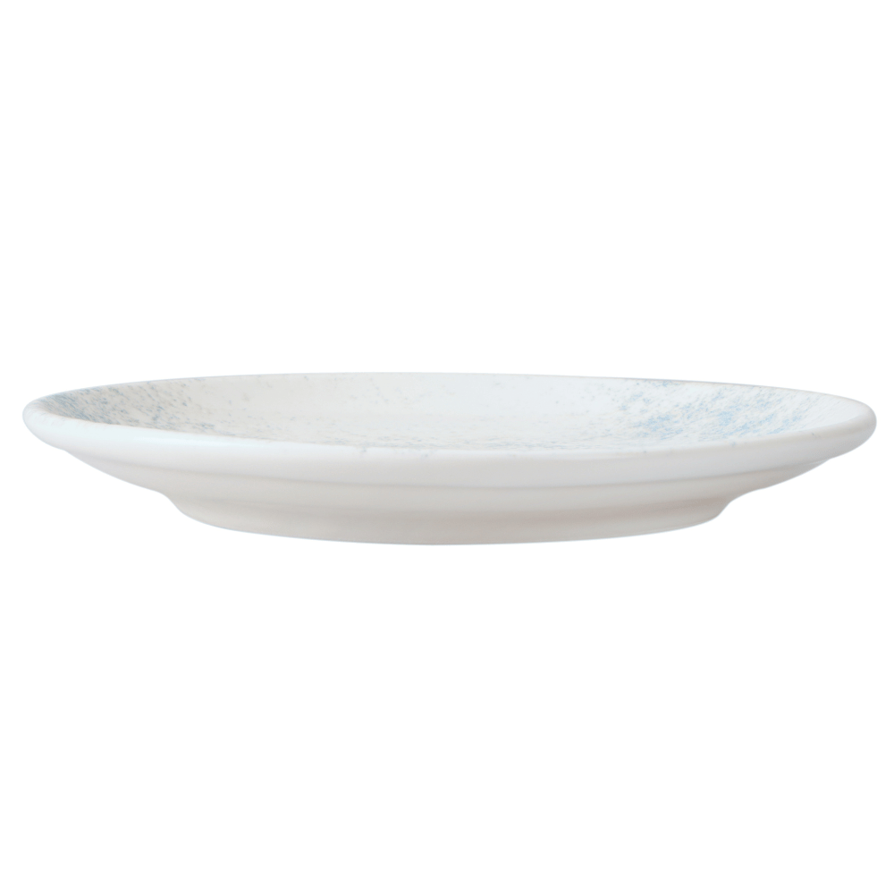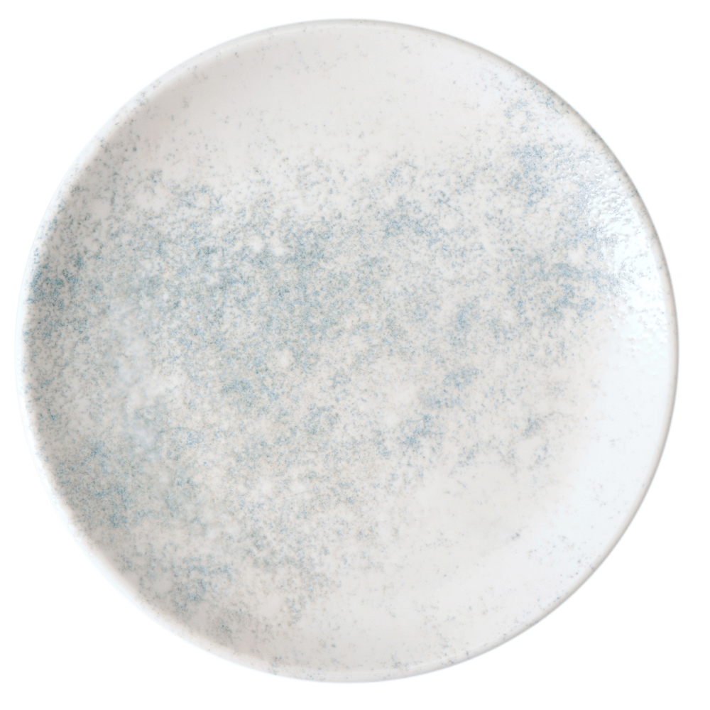 Our Smoky Matte Blue series has a textured effect, with light blue specks distributed irregularly across a matte white base. This subtle pattern gives the plate a natural, almost stone-like appearance, contributing to an organic and understated aesthetic ideal for modern table settings. Perfect for chefs and hosts who appreciate quiet luxury.